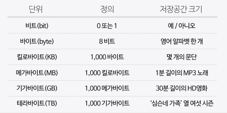 - 컴퓨터에서는 0과 1만으로 숫자 뿐만 아니라 글자, 사진, 영상, 소리 등을 저장할 수 있다.